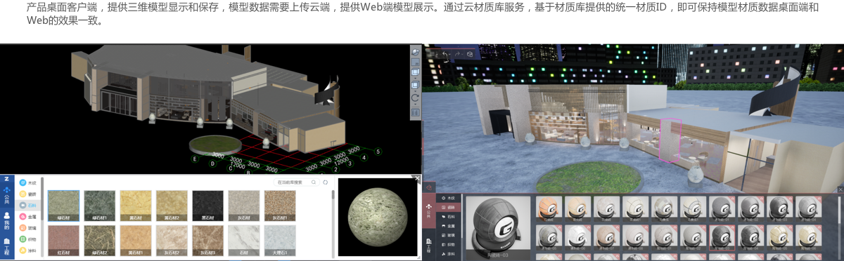 图形平台云材质库面向金沙9001以诚为本各终端产品,提供统一的材质服务,产品集成云材质库,可轻松获得大量精美材质和材质数据管理能力,既能快速提升显示效果,同时还能保持终端轻量化。